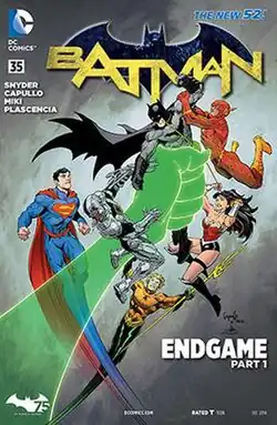 Written by Scott Snyder with art by Greg Capullo, "Endgame" was first printed in October 2014, in Batman #35. The Joker's role as the story arc's central villain was not announced, and was detailed only in the issue's final pages, revealing the character would return to comics for the first time since his disappearance at the end of the "Death of the Family" (DotF) story arc in 2012, also written by Snyder.[1] Snyder described "Endgame" as the concluding chapter of his Joker story, initially set up in "Zero Year" with a possible origin for the New 52 Joker, and continued with "Death of the Family" highlighting how Joker initially found meaning in his relationship with Batman.[1][2] "Endgame" details how Joker reacts to Batman's perceived betrayal of their dynamic. Snyder said: "So this is really sort of the Joker saying, 'I once found meaning in our relationship and your relationship to your rogues. Now I think you've betrayed that, and it's time for me to just burn everything down'. So I guess that's where I'm coming from with this". The story was planned in part from the conclusion of Snyder and Capullo's work on "Death of the Family", and Snyder wanted to convey the message that Joker and Batman's bond had been broken, by having the Joker turn Batman's closest allies against him, the Justice League.[1] "Endgame" celebrates the 75th anniversary of Batman and the Joker's debut and is designed as a transitional story that will alter the status quo of the Batman universe so that Snyder and Capullo can explore new elements afterwards.[2]