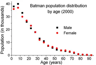 The population of the province is rapidly growing as a result of the inflow of workforce to the capital. Between 1990 and 2000, its population was rising at a rate of 5% per year. The population was stable in Beşiri and Gercüş, increasing by 1% per year in Kozluk and Sason and decreasing by 3% per year in Hasankeyf.[20] The total population was 634,491 in 2022.[2]