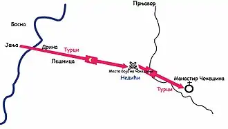 On 19 March, a day following the takeover of Valjevo, Serb troops commanded by Jakov and Luka Lazarević besieged Šabac but had difficulties as they were ill-equipped with only one cannon.[8] The defenders of the Šabac Fortress were around 300 troops under Mus-aga Fočić, the brother of Mehmed-aga Fočić, one of the four Dahije leaders.[8] On 25 March Mus-aga sent a request for reinforcement and help from the Dahije in Belgrade.[8] On 22 April reinforcement came from the Pashalik of Zvornik (in Bosnia), with Pasha of Zvornik Ali-beg Vidajić and kabadahija Mula Nožina crossing the Drina and arriving at Lešnica (Loznica) with thousands of troops.[8] As they feared hajduk ambushes in the Kitog forest which was on the way to Šabac, the Ottoman Bosnian troops instead took the route towards Čokešina where they sought to fight hajduk bands and the insurgent army that temporarily assembled in the area.[8] Hajduk harambaša Đorđe Ćurčija, the main hajduk leader in the Rađevina area, noted the troop movement and secretly entered the Ottoman Bosnian camp at Lešnica where he saw a large force that planned to break the siege at Šabac – he sent a message to Jakov Nenadović on 25 April regarding this, at a very delicate moment.[9] Those days, Jakov Nenadović and Mus-aga Fočić began talks about handing over Šabac to the Serbs, Fočić being unaware of the coming Bosnian reinforcement.[9] Jakov Nenadović thus strengthened guards around the town, as to not let that information through, while his nephew archpriest Matija Nenadović continued the talks.[9] The Čokešina Monastery was decided as an assembly point of Jakov Nenadović and his 400 troops, Ćurčija, knez Mihailo Ružić from Cer and the Nedić brothers that had mustered a hajduk band.[9]