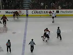 The rivalry saw a large revival in early 2020s. During a game on January 11, 2020, Calgary's Matthew Tkachuk and Edmonton's Zack Kassian began a feud. It began with two hits that Kassian felt were "predatory" in nature from Tkachuk, including a hit that knocked off Kassian's helmet. In response, Kassian attempted to fight Tkachuk, grabbing and punching him. Tkachuk did not fight back and assumed a defensive position, leading Kassian to be given a double-minor penalty for roughing and a misconduct. On the ensuing power play, Calgary scored the game-winning goal.[14] After the game, Tkachuk's decision to "turtle" stirred controversy among players, fans, and sports writers.[15] The teams met again on January 29, which saw Tkachuk and Kassian fight near the end of the first period, with Kassian saying “Thanks kid, I appreciate you doing this."[16] In the next game on February 1, the first goalie fight[17] between the two teams erupted, in the midst of a full line brawl.[18] It was considered by many fans as the epitome of the battle of Alberta, with Oilers radio announcer Jack Michaels saying, "This is the battle of Alberta we've been waiting for, for three decades!" during his coverage of the game.[19]