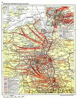The sector in which most of the fighting in the overall offensive took place was the Seelow Heights, the last major defensive line outside Berlin.[40] The Battle of the Seelow Heights, fought over four days from 16 until 19 April, was one of the last pitched battles of World War II: almost one million Red Army soldiers and more than 20,000 tanks and artillery pieces were deployed to break through the "Gates to Berlin", which were defended by about 100,000 German soldiers and 1,200 tanks and guns.[44][45] The Soviet forces led by Zhukov broke through the defensive positions, having suffered about 30,000 dead,[46][47] while 12,000 German personnel were killed.[47]