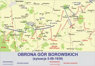Battle of Borowa Góra (Polish: Bitwa pod Borową Górą) refers to the series of battles from 2 to 5 September 1939 that took place near the Góry Borowskie hills, south west from Piotrków Trybunalski and east of Bełchatów. The battle, fought between the Wehrmacht and the Polish Army in the vicinity of Łódź, was a direct consequence of the Battle of the Border, an early part of the German Invasion of Poland[1]