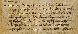 The poem is preserved in manuscripts A, B, C and D of the Anglo-Saxon Chronicle.[6] In Old English manuscripts verse is set out as a continuous entry, as in prose, but poetry is sometimes marked by pointing, for example at every half-line in ms A.[7] The 73-line long poem is written in "indeterminate Saxon," that is, the regular West-Saxon dialect in which most surviving Old English poetry is copied. It is referred to as a panegyric celebrating the victory of Æthelstan and Edmund I.[8]