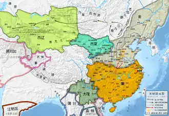 In 1122, the Jin captured the Khitan Supreme and Western Capitals. The Song tried to capture the Liao Southern Capital of Yan (modern Beijing), but it fell later that year to the Jin.[7] Negotiations between the Song and Jin produced a treaty in 1123, but bilateral relations deteriorated because of territorial disputes over the Sixteen Prefectures.[8][7] In 1125, the Jin invaded the Song.[9][4]