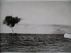 The crew of Bartolomeo Colleoni fought on but were unable to manoeuvre or use the main armament; despite the fire from her 100 mm (3.9 in) guns, she was sunk by three torpedoes launched from Ilex and Hyperion at 09:59. Sydney continued to engage Bande Nere. Sydney was hit in the funnel by an Italian shell but hit Bande Nere at least twice, killing eight in the bow and the hangar. Later, Sydney disengaged because she was short of ammunition, Bande Nere returned to Benghazi, shadowed by the battleship HMS Warspite and a screen of destroyers.[4]