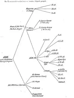 - ^ At this point, 2nd Isonzo Army also commanded XXIV Corps (24th and 53rd Divisions), IV Corps (43rd and 20th Divisions), and a Reserve (28th, 29th and 9th Divisions) – all Austro-Hungarian."The Leadership in Austria-Hungary during WWI". Retrieved 8 November 2012.