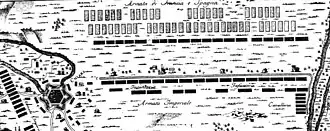 Villeroi ignored Catinat's warning that Eugene was in a strong position, remarking that the King, "had not sent so many brave men just to look at the enemy through their spy glasses."[6] On 1 September the Franco-Spanish infantry advanced. Deceived by the report of spies that the Imperialists were retiring, Villeroi crossed the Oglio and pushed on to Chiari expecting to attack their rear guard.[9] The attack began around 2 p.m. when three French brigades approached Chiari and overpowered the Imperial troops there without much difficulty. However, instead of facing the rear guard the French commander encountered the whole Imperial army securely entrenched in their positions. As the Bourbons' army approached the Imperial positions, Eugene forbade his men to fire. Loading their artillery with canister shot, they only unleashed a withering fire when the Bourbon army entered point-blank range. This disordered the attackers and a chaos ensued which the French and Spanish commanders could not suppress. While this was going on Chiari was recaptured by the Imperials after a fierce struggle.[8] The Bourbons were driven back with heavy casualties in a contest as destructive as any battle during the war in Italy.[9] With only minor losses the Imperial army had inflicted over 3,000 casualties in the ranks, and over 250 officers. This number would grow rapidly as fever attacked the wounded.[10]