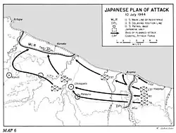 On the night of 10/11 July, an assault force of around 10,000 Japanese attacked en masse across the Driniumor.[19] In support of this effort, they moved several 70 mm and 75 mm artillery pieces forward through the jungle.[3] The Japanese attack plan had envisaged three regiments—the 78th, 80th and the 237th—attacking simultaneously in a contiguous line abreast,[20] on a front between Paup and Afua.[21] Following a five-minute artillery bombardment, the attack began at 22:55 hours on 10 July.[3] The initial attack was poorly coordinated, being hampered by the terrain, which resulted in the 78th launching their assault 20 minutes before the 80th who were followed by the main elements of the 237th around 02:00 hours on 11 July. By 03:00 hours, the assault petered out, having gained about 1,300 yards (1,200 m). A secondary attack began at around 05:00 hours when follow on elements of the Japanese 237th Infantry Regiment, along with supporting medical, staff and artillery personnel crossed the Driniumor. This secondary movement continued until around dawn when elements of the two main Japanese assault regiments—the 78th and 80th—began reorganising on high ground about 800 yards (730 m) northwest of the U.S. line. The 237th, whose commander, Colonel Nara, had become separated from his headquarters, took longer to reorganize.[22]