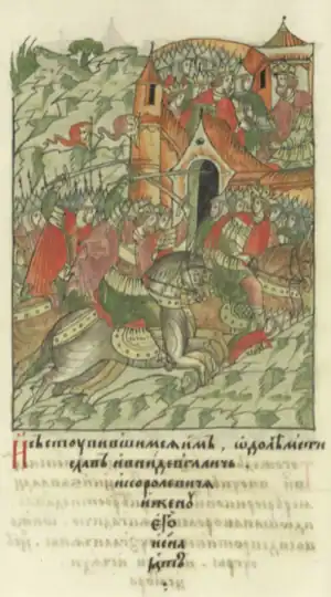 The coalition of Ruthenian princes, led by Mstislav Mstislavich, formed two main battle groups, supported by troops of the Polovtsians. The Hungarian-Polish forces deployed in two battle lines, with the Hungarian File troops supported by the Halychians on one wing and the Poles on the other.[1] The battle began with a strike by the Poles, which forced Vladimir Rurykovich's unit to retreat. However, at the decisive moment, thanks to the attack of the Polovtsians and the return of some of the Ruthenian troops, Mstislav managed to tip the balance of power. The Hungarian and Polish forces were shattered and the voivode File was taken prisoner.[2] The Galician-Volhynian Chronicle describes the moment as follows:[3]
