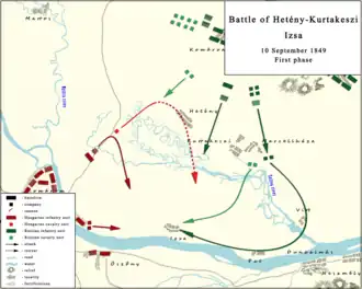 At sunrise of 10 September, General Klapka sent an infantry battalion, a hussar company, and half a cavalry battery across the Zsitva, north of Hetény, to attack the village.[1] But the vigilant Cossacks thwarted this enterprise, and after a skirmish, forced the hussars to retreat.[1] Then between Hetény and Kurtakeszi, the Russians deployed 2 infantry battalions, 4 uhlan companies, and 12 guns.[1] In this first phase of the battle, the Russians wanted to set a trap for the Hungarians, trying to make the Hungarian troops believe that the place is not properly defended, then, with considerable forces, to crush them.