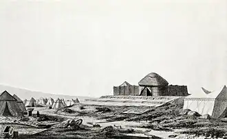 On May 20, the Bukharan army attacked the Russian detachment: mounted crowds of Bukharans and Kirghiz surrounded it from all sides, especially pressing hard on the baggage train of Lieutenant Colonel Fovitsky.[6]