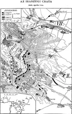 Although the Hungarian front line was only 22 km (14 mi)-long, Görgei could only deploy two-thirds of his troops at any point in the battle because of his orders to his generals regarding their movements prior to the attack on 7 April, the day the battle was to begin. His orders to his corps and units in what direction to march that day, were influenced by his belief that the Austrian troops are still along the Galga line: the VII. corps had to move towards Aszód, reach the Galga, and occupy Bag; the I. corps from Süly towards Isaszeg (marching on the ridge which stretches between the two localities), sending the brigade from its left wing to Pécel; the III. corps, with maximum precautions, had to advance from Tápiószecső through Kóka and Királyerdő towards Isaszeg, sending detachments to occupy the Szent László and Szentkirály farms; and II Corps had orders to take up a position at Dány and occupy with a strong detachment Zsámbok.[14] He would be in Kóka, 15 km (9.3 mi) from Isaszeg.[15] Görgei's plan was for Gáspár to pin with the VII. corps, the Austrian left wing while the other three corps (I., II., III.) attacked their right flank at Isaszeg. This would push the Austrians northwards from Pest, enabling the liberation of the Hungarian capital on the Eastern bank of the Danube.[14] This forced a dilemma on Windisch-Grätz, to accept a battle where the Hungarians had superiority or to retreat to Pest, which was hard to defend, being open to attacks from three directions. It also had only one unfinished bridge (the Chain Bridge), to allow his troops to cross the Danube to Buda on the other side, should he need to retreat, which would have been impossible. Windisch-Grätz chose the lesser of two evils.[16]