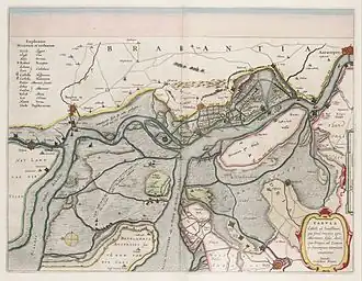 The Prince of Orange departed The Hague on 25 May and, on 1 June, the same day that the French Army laid siege to Saint-Omer, in Artois, he took command of the field army of the Dutch States, which had been assembled at a camp in the village of Lithoijen, in Brabant. A 3,000-men detachment under Count Henry Casimir of Nassau-Dietz was sent to Nijmegen to guard the southern border of the Republic, while Frederick Henry led the bulk of the army to Dordrecht, where it embarked aboard a fleet of 30 warships that convoyed it with its artillery, horses and baggage to Bergen op Zoom.[21] Frederick Henry had planned at first to besiege Hulst, but, pressed by a deputation of the States General, he finally agreed to move upon Antwerp. To fully invest the city and prevent it from being relieved from Hulst and Ghent, the prince dispatched a force of 7,000 infantry and 300 cavalry under Count William of Nassau-Siegen aboard 53 large boats and many smaller ones —taken in 1631 from the Spanish at the Battle of the Slaak— to land at the Waasland, west of Antwerp.[22][23] They embarked at Dordrecht a day before that the main army did it, though both forces reunited briefly at Bergen op Zoom before the landing operation was undertaken.[24]