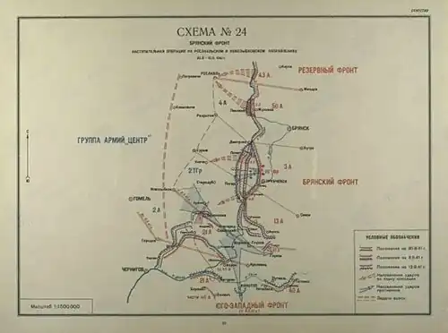 The Western Front was under the command of General Semyon Timoshenko, the Reserve Front under the command of General Zhukov, and the Bryansk Front under the command of General Yeryomenko. On 25 August, Stavka ordered them to carry out concentrated counter-attacks in the Smolensk-Yelnia-Novozibkov axis to repel Guderian's invasion, and in the process to confront the entirety of Army Group Center.[90] Accordingly, after the dissolution of the Soviet Central Front and addition of the Soviet 21st Army under its command, the Bryansk Front was ordered to defeat the Panzer Group 2 by conducting a direct attack and to bolster the strong defense of the north of Kiev. This operation was to take place on a very wide front line from Zhukovka in the north to Yampol in the south. On 26 August, Stavka asked the Bryansk front to encircle and destroy Guderian's forces in Starodub, and bring the flanks of the Soviet 13th and 21st armies closer to each other. This order was issued while the assembly of the Bryansk Front was not yet completed, and its implementation would cause the use of the Red Army forces piecemeal.[91] There was also a large gap between the main part of the Bryansk Front and the reinforcements from the former Central Front, and only the Soviet 50th Army was fresh and capable of sustained offensive operations.[92] Stavka insisted on continuing these counterattacks despite these problems.[93] False information led the Red Army to believe that the Germans were planning to inflict a heavy blow on the right (north) flank of the Bryansk front. Therefore, Shaposhnikov ordered Yeryomenko to reinforce this part with the 50th Army. That action caused the army to move from the threatened area to an area where there was no danger, and the counterattack of the Bryansk front was greatly weakened at a vital point.[94]