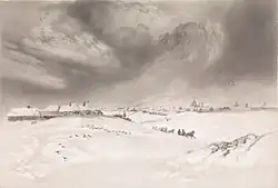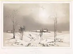 A blizzard struck on 14 November, bringing heavy snowfall of approximately 5 ft (1.5 m) and a temperature plummet to -21 °R (= -24°C or -11°F).[41][e] This led to further casualties among men, horses, and the abandonment of artillery.[43] The intense cold enfeebled, first of all, the brain of those whose health had already suffered, especially of those who had had dysentery, but soon, while the cold increased daily, its pernicious effect was noticed in all...actions of the afflicted manifested mental paralysis and the highest degree of apathy.[44] Ostermann-Tolstoy, part of Miloradovich's avant-guard, shelled Napoleon and his guards, but the assault was repelled.[45] While Miloradovich desired to attack, he was not granted permission by Kutuzov. Meanwhile, Claparède and the Vistula-legion arrived at Krasny since August occupied by a small French battalion. They were expelled by Ozharovsky's flying column.[46]