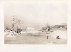 Ney suffered more than half of his forces' losses, with nearly all the cavalry and all but two artillery pieces vanishing.[152] The devastating defeat of the III Corps prompted Miloradovich to offer Ney another opportunity for an honorable surrender.[153] In the early evening, Ney chose to withdraw with his remaining troops.[154][155] Following the advice of colonel Pelet he maneuvered around the Russian forces at Mankovo, tracing the Losvinka's path for several hours. By 9 p.m., they reached the desolate Syrokorene, located about 13 km north. There, they encountered a reserve of red beets, which they prepared for sustenance. At some point during the night, Ney learned of the impending threat by Denisov.[156] Amidst the darkness, he opted for a daring crossing of the Dnieper, purportedly between the remote hamlets of Alekseyevka, Varechki or Gusino. These spots boasted shallow river points but nearly vertical slopes.[157] Sappers employed logs and planks to create makeshift crossings over the ice. One by one, but not without significant losses, they managed, leaving two guns, part of the detachment and wounded who could not continue.[158][v] Ney's men enduring the crossing on all fours,[159] with the elements and the Cossacks reduced their ranks to a mere 800 or 900 resolute soldiers.[160][161][162]