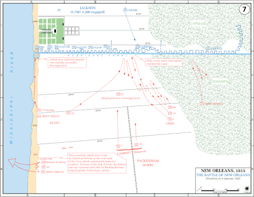 The British dug a canal to enable 42 small boats to get to the river.[67] Preparations for the attack had floundered early on January 8, as the canal collapsed and the dam failed, leaving the sailors to drag the boats through the mud with Thornton's right bank assault force. This left the force starting off just before daybreak, eight hours late according to Thornton's dispatch,[68] assessed in 2008 to be 12 hours late.[69][note 12] In the early morning of January 8, Pakenham gave his final orders for the two-pronged assault. The frontal attack was not postponed, however, as the British hoped that the force on the right bank would create a diversion, even if they did not succeed in the assault.[67]