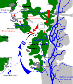 Between the Russian and Swedish forces the Yakovetski and Budyschenski woods formed a corridor, which the Russians defended by building six forts across the gap.[29]: 60 Peter, in addition, ordered four more redoubts built so the entire system of ten forts would have a T shape, providing flanking fire to a Swedish advance.[29]: 60 Two of the redoubts were still being constructed on the morning of the battle, but 4,000 Russians manned the remaining eight, with 10,000 cavalry under General Aleksandr Danilovich Menshikov stationed behind them.[29]: 60