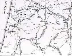 The XXI Corps was deployed without a corps reserve. The 60th Division was positioned on the coast with the 7th (Meerut) Division on their right, then the 75th Division with the longest frontage, was followed by the 3rd (Lahore) Division. On their right, at the eastern end of the XXI Corps and the Battle of Sharon's front line in the Judean Hills, the 54th (East Anglian) Division with the Détachement Français de Palestine et de Syrie, held the Rafat salient.[25][Note 6]
