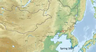 Meanwhile, a Ming army of 50,000 had been dispatched and was on its way to besiege Shenyang. News of this reached Nurhaci, who rushed his banners out to confront the Ming before they could entrench themselves around the city. Taken by surprise, the Ming army was only able to fire their guns once before the Jin cavalry was upon them. The Jin cavalry caught them in a pincer attack, collapsing one side then another, until the entire army broke. They chased the scattered remnants for a time before regrouping. Next Nurhaci intercepted another army from Liaoyang and defeated it in quick succession.[13]