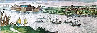 On April 16, Ernest left with a fleet of 23 Chaika carrying 1,500 quintals of flour and 13,000 bushels of oats. Ernest successfully reached the place and loaded the supplies. After that, the Austrian fleet returned back; however, they met the Ottoman navy ahead of them. A battle ensued, which turned out in favor of the Ottomans when a powder explosion was triggered on the ship of Lieutenant Colonel Petrasch by a cannon shot, killing the majority of the crew. Petrasch managed to escape to another ship, but during the confusion, all the ships turned toward the shore, and, in full panic, the crew, who might have believed their commander was dead, fled.[2][3][4][5]
