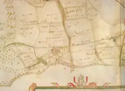 Harting Place was owned by Sir John Caryll and he and his family lived there in the manor house directly west of the Parish Church of Saint Mary and Saint Gabriel. It was the seat of the Manor of West Harting with the Manor of East Harting being owned by Sir William Ford. The two manors were split down the middle by the street that runs through the middle of South Harting, today literally called 'The Street'.[12][13] Harting Place is described by archaeologist George Anelay as "a very impressive set of buildings"[13] and is visible on the 1632 West Harting Manorial Map (pictured right); it had a large crenellated gatehouse immediately north of the church which was equally as big as the manor house and faced onto The Street, its own fenced private deer park, a large walled private garden between the church and the manor house, an orchard to the north, and four ponds to the south — the largest of which may have had its own water-powered mill.[13][14]
