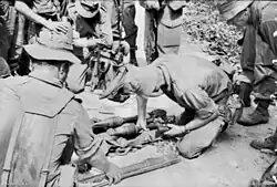 At first light the next morning Australian clearing patrols located 89 dead and 11 wounded Viet Cong in front of their positions. The bulk of the casualties had been inflicted by the Americans,[19] but it was later determined that at least 17 Viet Cong had been killed by 1 RAR.[20] Others had been disintegrated by artillery and tank fire and the battlefield was littered with shattered human remains, including severed limbs and chunks of flesh, while red pulp covered the rubber trees that were still standing. Later, 154 bodies were bulldozed into a B-52 bomb crater nearby, while it was estimated that a further 200 Viet Cong casualties had been removed from the battlefield.[19] Fifteen Viet Cong had also been captured during the battle, as had a large quantity of equipment, including small arms and ammunition, crew-served weapons and grenades.[2] The villagers of Ap Bo were again used by the Viet Cong to carry many of the dead and wounded from the battlefield with ox carts, and they also suffered a number of casualties from artillery and mortar fire landing in the area.[20] In contrast, American casualties were limited, consisting of 11 killed and 72 wounded. Australian casualties were lighter still, with just two men wounded.[8][21] One American tank had also been destroyed, while two tanks and four armoured personnel carriers were damaged.[2] Overall, the commander of the combined US-Australian force believed that they had won an impressive victory, but his troops were exhausted and with ammunition running low, Glotzbach decided not to pursue the withdrawing force. Instead, the Americans and Australians focused on securing the battlefield and evacuating their own casualties.[21]
