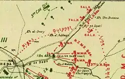 During the next two days, the New Zealand Mounted Rifle Brigade at Ras el Nagb, continued to be involved in heavy fighting.[93] Many counterattacks launched by the Ottoman forces were withstood by the 1st Light Horse, the 5th Mounted and the New Zealand Mounted Rifle Brigades, between 3 and 5 November.[89] Meanwhile, fighting for Tel el Khuweilfe, continued day and night during 4 and 5 November, when Ottoman reserves strongly attacked the EEF units, but the results were inconclusive.[23][89] Although the 53rd (Welsh) Division renewed their attacks on the Tel el Khuweilfe position, they were held up during the "least successful of all the confused fighting which took place in the hills".[95] To add to the confusion, the EEF Intelligence Department had lost track of the whereabouts of an Ottoman division that had been sent to reinforce Beersheba on 31 October, and it ultimately ended up strengthening the defences at Tel el Kuweilfeh.[17]