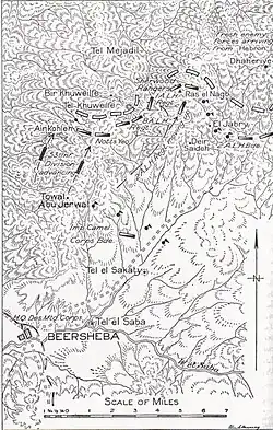 By 15:00, the South Notts Hussars had pushed back small groups of Ottoman defenders off Ras en Naqb, some 12 miles north of Beersheba, capturing 11 prisoners and two guns.[67] However, strong opposition to the attacks on Tel el Khuweilfe by the 8th Light Horse Regiment and on Khirbet Abu Khuff by the Sherwood Rangers prevented their capture, and the isolated South Notts Hussars were forced to retreat at nightfall back from Ras en Naqb.[63] However, after the 8th Light Horse Regiment took up a line, they continued their attack through the night.[66]