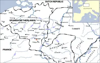 Administrative problems and the late arrival of contingents delayed the opening of the Allied offensive in the region until late June. Waldeck moved from near Tienen and headed towards Fleurus; the two armies spent the next two months marching and counter-marching in an attempt to gain a strategic advantage.[11] By 24 August Waldeck had crossed the Sambre and had camped near the small ancient town of Walcourt where he was satisfied to live upon enemy territory.[12]