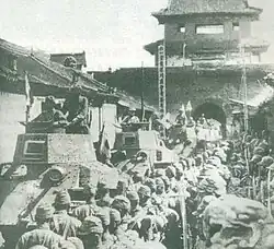 The campaign also saw the first major Chinese victory of the war at Taierzhuang, where warlord armies under the command of Li Zongren and Tang Enbo managed to defeat Japanese forces in fierce close quarters urban warfare.[12] The campaign also served as a morale boost for the Chinese army and population, who approached the following defense of Wuhan with renewed confidence and determination.[13]