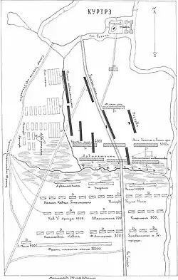 Some of the French footmen were trampled to death by the advancing cavalry, but most managed to get around them or through the gaps in their lines.[18] The cavalry advanced rapidly, hoping to give the Flemish no time to react.[18] The brooks presented difficulties for the French horsemen and a few fell from their steeds.[18] Despite this, the crossing was successful in the end.[18] The French then hastily reorganized themselves for a direct assault.[18]