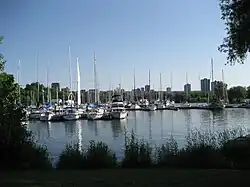 A waterfront shuttle is provided as a free service offered by the Hamilton Street Railway. It has a seasonal schedule that runs weekends from May-to-October connecting Hamilton's downtown core to the waterfront and attractions that can be found there like HMCS Haida and the Parks Canada Discovery Centre. The route circles Hamilton's downtown core around York Boulevard (north), Bay Street South (west), King Street West (south) and James Street North (east). Then it travels north along James Street and the Art District until it reaches the waterfront at Guise Street past the Leander Boat Club, Royal Hamilton Yacht Club, Hamilton Chamber of Commerce and the Harbour West Marina Complex. Then the route hangs a left on Discovery Drive, the site of the Parks Canada Discovery Centre. Also at this site is the Hamilton Harbour Queen (cruise boat), Hamiltonian (tour boat) and the Hamilton Waterfront Trolley.[7]