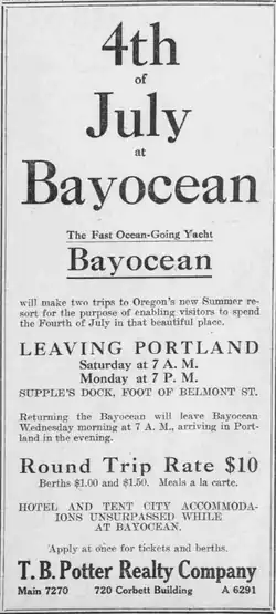 In March 1912, the company, through a newly hired resort manager, was announcing that Bayocean would be available for visitors for "deep sea fishing trips and moonlight excursions" during the summer season.[26] There would soon no longer be any need to use the yacht to transport resort guests from Portland, because a rail line, called the "Lytle Road" had been completed by the Southern Pacific from Portland, across the coast mountain range, and into Tillamook, a distance of 85 miles.[26] The T.B. Potter Realty Company and the railroad would cooperate to advertise the resort and rail travel to it during the forthcoming summer.[26]