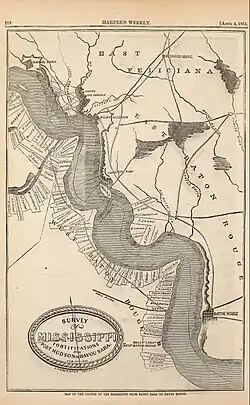 Bayou Sara was a town in West Feliciana Parish, Louisiana, United States until the Mississippi River washed it away in 1927. In the early 1800s it was the most important landing between New Orleans and Natchez, Mississippi.[1] According to the American Guide to Louisiana, Bayou Sara was "founded in 1790 by John H. Mills and Christopher Stewart, who established a trading post on the river which grew into one of the most flourishing ports between Natchez and New Orleans. With the advent of the railroad, trade diminished and the town gradually declined, so that now all that remains of Bayou Sara are a few wooden shacks and a tall, uninscribed monument, and these have been absorbed by St. Francisville."[2]