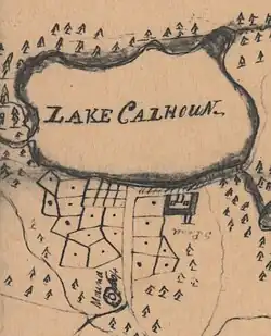 Bde Maka Ska and the wetlands surrounding it provided game, fish, and wild rice for Dakota in the years before contact with European settlers. No permanent settlement was observed before 1828.[13][14] Between 1829 and 1839, Bde Maka Ska was the site of the Bdewákhathuŋwaŋ Dakota agricultural village known as Ḣeyate Otuŋwe.[15] This village began as an effort by Indian agent Lawrence Taliaferro to encourage Dakota living in the area to adopt European agricultural practices.[13] The Dakota chief Cloud Man led the village, which by 1832 produced enough corn to trade with the settlers.[16] The Dakota in Ḣeyate Otuŋwe not only traded corn but also shared it with neighboring bands.[15] Ḣeyate Otuŋwe even became a popular tourist destination for white travelers starting in 1835. George Catlin painted the village in 1836.[17]