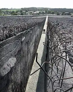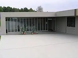 The symbolic ramp continues into the museum building,[31][39] made of reinforced concrete, cast iron, and light granite.[40] It is positioned perpendicular to the entrance gate.[37] It is shaped as a single-story, long rectangular building.[40] It features a minimalist aesthetic,[39] with no windows,[38] and only a few vertical divisions in the façade.[39] The museum building, together with the ramp and boundary wall, forms a unified architectural structure, which, when viewed from the Bełżec buildings, resembles a cemetery wall.[38] From the Bełżec side, the height of the building – as well as the adjoining wall – reaches only two meters.[27][40] Due to the appropriate terrain shaping, it rises only from the interior side of the memorial site.[40] The building gives the impression of being buried in the ground and resembles a railway car depot near the ramp.[38][40]