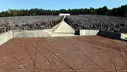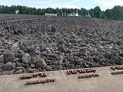 The entrance to the memorial site was located where the railway siding had previously been. Behind the main gate, there is a concrete area – a ramp.[38] To the left of the gate, a sculptural installation was built in the form of a pile of railway rails and slag. It symbolizes the transports arriving at Bełżec, as well as the process of cremating bodies on the burning racks.[31][39] On the concrete wall standing near the pile, a poem by Israeli poet Dan Pagis was engraved.[31]