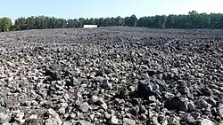 The new memorial covered the entire area of the former camp site,[27] completely changing its appearance in terms of landscape and architecture. According to the creators' intention, the focus was placed on the protection of mass burial sites[36] and honoring the victims with respect for Jewish traditions and religion.[37] As a result, the most important element of the monument was the space of a symbolic mass grave, covered with a layer of gray-black blast furnace slag and barren soil.[38][39] It rises gently, reaching a height of 11 meters at its narrowest point.[40] The places where mass graves were located were marked with a greater gradation of material.[37] Several oak trees that grew during the existence of the death camp were preserved on the symbolic grave site.[33] They are referred to as "living monuments"[41] or mute[42] and last "witnesses" to the genocide committed in Bełżec.[38]