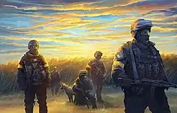 Beata's art on the topic of Ukrainian border guards and military servicemen began with a cartoon of border guard Roman Dumyak, who served at the Krasna Talivka border checkpoint. The couple fundraised money to purchase a collimator for this serviceman, and Beata drew a cartoon of him on the box with collimator, taking a photo from social media as a basis.[6] The first serious drawing on this topic appeared after the couple visited a military hospital, where the artist was inspired to create a picture of a Ukrainian border guard. This was followed by other drawings. In the beginning, in addition to the desire for creative expression, she was also motivated to draw by the opportunity to mock her Russian peers. According to Beata, popularity came to her when her drawings were reposted by the Facebook page of the "Right Sector".[8]