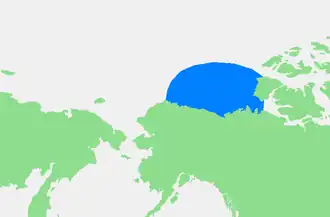 The Beaufort Sea is frozen over through the year, except for August and September when the ice breaks near the coast and opens what was once a 50–100 km (31–62 mi) wide strip of open water.[2] During the 2000s, due to climate change in the Arctic, the ice-free area in late summer greatly enlarged. During the record minimum extent of Arctic sea ice in September, 2012, the sea ice boundary had retreated northward much farther than normal from the coast.[29][30][31][32]