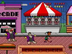 The player controls either LaShawn or Kahlil as they wreak havoc in Fun World, the Disneyland-esque theme park featured in the film.[4] Similar to both Konami's The Simpsons and Kaneko's B. Rap Boys, players must contend with security guards, disgruntled mascots, and pirates who work for the theme park.[5] Other stages include a haunted house,[5] a pirate ship,[5] and the pits. Both characters have unique special attacks.