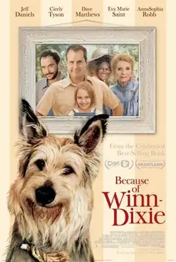Because of Winn-Dixie is a 2005 American comedy-drama film based on Kate DiCamillo's 2000 novel of the same name, with the screenplay written by Joan Singleton, produced by Trevor Albert and directed by Wayne Wang. It was produced by Walden Media and released by 20th Century Fox. It stars Jeff Daniels, Cicely Tyson, Dave Matthews in his film debut, Eva Marie Saint, and AnnaSophia Robb in her feature film debut. It premiered at the USA Film Festival on January 26, 2005, and was theatrically released on February 18, 2005. It received mixed reviews from critics and earned $33.5 million against a production budget of $14 million. It was released on DVD and VHS on August 9, 2005, by 20th Century Fox Home Entertainment.