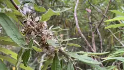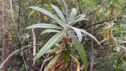 Bedfordia salacina is found in sclerophyllous forests that are widely adapted to fire,[6][9] while wetter environments have fire free periods up to 100 years, drier environments have fire free periods of 25–50 years. Bedfordia salicina has low propensity to propagate fire among wet sclerophyll and gully species and require considerable moisture loss before flaming can occur. When oven dried, Bedfordia salicina can reach 65-72% moisture loss from its initial weight,[10] at which Bedfordia can both ignite and spread fire rapidly. Following fire, Bedfordia salicina have the capacity to regenerate vegetatively via lignotubers or seed.[6]