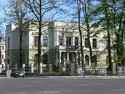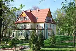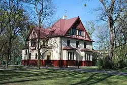 At 15 and 15a Bednarska Street, the Joint-Stock Company Leonhardt – Woelker – Girbardt built two nearly identical post-Art Nouveau villas for Ernst Leonhardt between 1907 and 1909, situated in a park-like setting (Leonhardt purchased part of the park reaching up to the planned Bednarska Street somewhat earlier, in 1905).[15] The villas were occupied by Leonhardt's business partners – his brother-in-law Wilhelm Völker and Saxon Hilmar Girbardt.[16] The private park was fenced, with two entrances from Bednarska Street (a third led from Pabianicka Road), but remained private until 1952 despite changes in ownership.[12][17][18][19] It is likely that tennis courts were also built in the park along Bednarska Street before World War I, which existed there until the 1960s.[17][20]