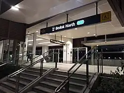 Bedok North MRT station serves the Downtown Line and is located between Bedok Reservoir and Kaki Bukit stations. The station code is DT29. The station is located along Bedok North Road.[11] The station has 3 entrances serving surrounding HDB estates, Damai Primary School and a future integrated hospital.[2] Bedok North Station is also a Civil Defence (CD) shelter. [12]