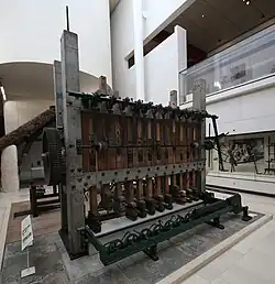 Beetling is a textile finishing method used to obtain an aesthetic finish (i.e. lustre) in cotton- or linen-based fabrics. The fabric is wetted and treated with potato starch, and then hammers repeatedly rise and fall on exposed fabric for over 100 hours.[1] The finish imparts a lustrous and absorbent effect which is ideal for linen dishcloths.[2] It also changes the texture of the fabric, stiffening it somewhat so that it is similar to leather.[3]