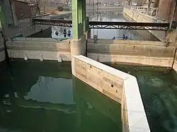 The head of the Beijing-Miyun Water Diversion Canal was located at Gongzhuangzi Village, 5 km downstream of the Baihe River main dam of the Miyun Reservoir. The head of the canal was designed with a regulating pond dam and a flood discharge gate . In addition, it was also equipped with a diversion canal water inlet gate, a ship lock and a hydropower station. The dam and flood discharge gate had already been built during the construction of the Miyun Reservoir, while the ship lock and the hydropower station were reserved and would not be built in the first phase of the project. Therefore, only the diversion canal water inlet gate remained to be built in the first phase of the project. This water inlet gate is a two-hole type with a 2.5m × 4.0m flat steel gate. The total height from the bottom of the gate is 86 meters. The design flow rate can reach 40 cubic meters per second, which was later changed to 50 cubic meters per second. A capacity of 100 cubic meters per second was reserved to prevent accidents.[8]