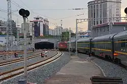 The Beijing underground cross-city railway is a short railway connection in Beijing. This railway line includes the Qiansanmen Tunnel. The speed limit is 120 km/h.[1] It connects the important transportation hubs Beijing railway station and Beijing West railway station via a tunnel. It also connects lines from southern and western areas with lines from northeast China.[3] The railway has a length span of 9.156 km (5.689 mi), and has been officially operational since March 20, 2015.[4]