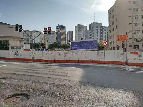 The construction of the station began in 2016, when the opening date was estimated to mid-2020.[2] Later, Governor Geraldo Alckmin promised the opening of the first phase of the line to 2020, time which was discarded due to a year of delay in the financing of the Federal Savings Bank, which would be used for the expropriations. In June 2016, the opening of the line was estimated for 2021,[3] time kept in October 2017, when the resume of the construction was announced for the beginning of 2018.[4][5][6] Currently, the construction is suspended, due to the involvement of the construction companies of the Move São Paulo consortium (Odebrecht, Queiroz Galvão, UTC Participações) in Operation Car Wash, which caused them to not get the financing of R$ 5.5 billions (US$ 1,575,344,427.58) with the Brazilian Development Bank (BNDES) for the continuity of the construction. The State Government of São Paulo is currently in negotiations with international companies, including Spanish Acciona[7] and Chinese China Railway Construction Corporation.[8]